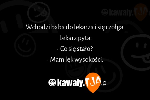 Wchodzi baba do lekarza i się czołga. Lekarz pyta: - Co się stało? - Mam lęk wysokości.