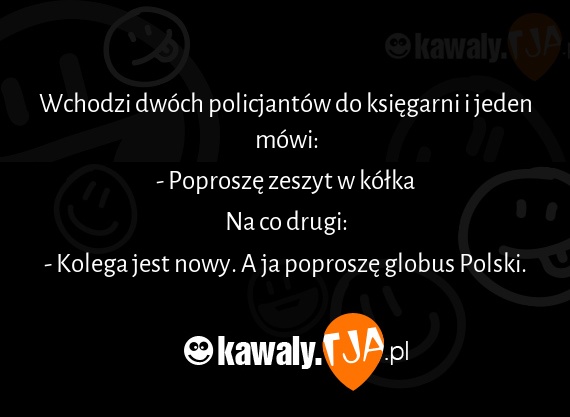 Wchodzi dwoch policjantow do ksiegarni i jeden mowi: - Poprosze zeszyt w kolka Na co drugi: - Kolega jest nowy. A ja poprosze globus Polski.