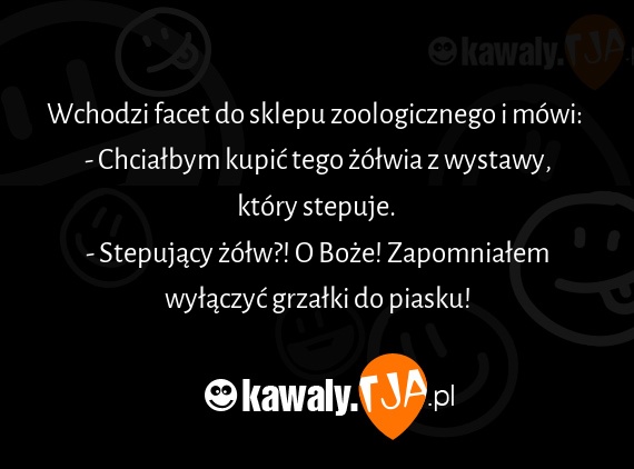 Wchodzi facet do sklepu zoologicznego i mówi: - Chciałbym kupić tego żółwia z wystawy, który stepuje. - Stepujący żółw?! O Boże! Zapomniałem wyłączyć grzałki do piasku!