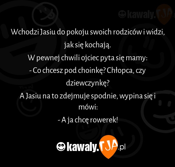 Wchodzi Jasiu do pokoju swoich rodziców i widzi, jak się kochają. W pewnej chwili ojciec pyta się mamy: - Co chcesz pod choinkę? Chłopca, czy dziewczynkę? A Jasiu na to zdejmuje spodnie, wypina się i mówi: - A ja chcę rowerek!