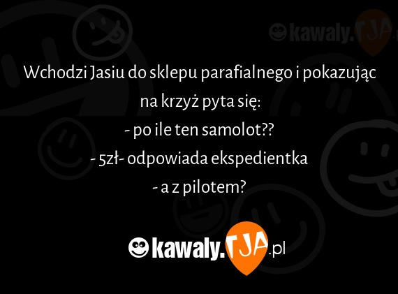 Wchodzi Jasiu do sklepu parafialnego i pokazując na krzyż pyta się: - po ile ten samolot?? - 5zł- odpowiada ekspedientka - a z pilotem?
