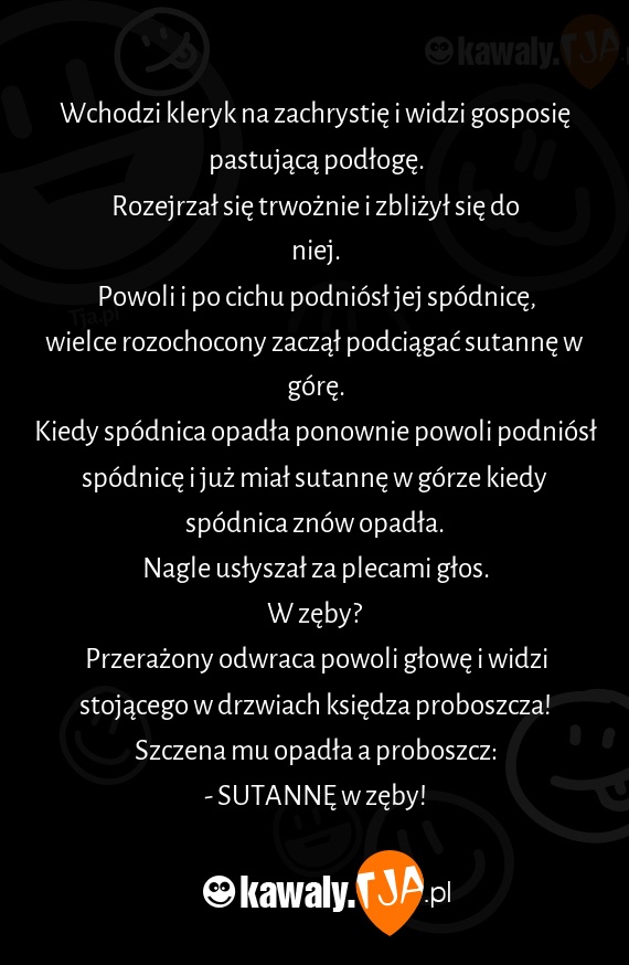 Wchodzi kleryk na zachrystię i widzi gosposię pastującą podłogę.