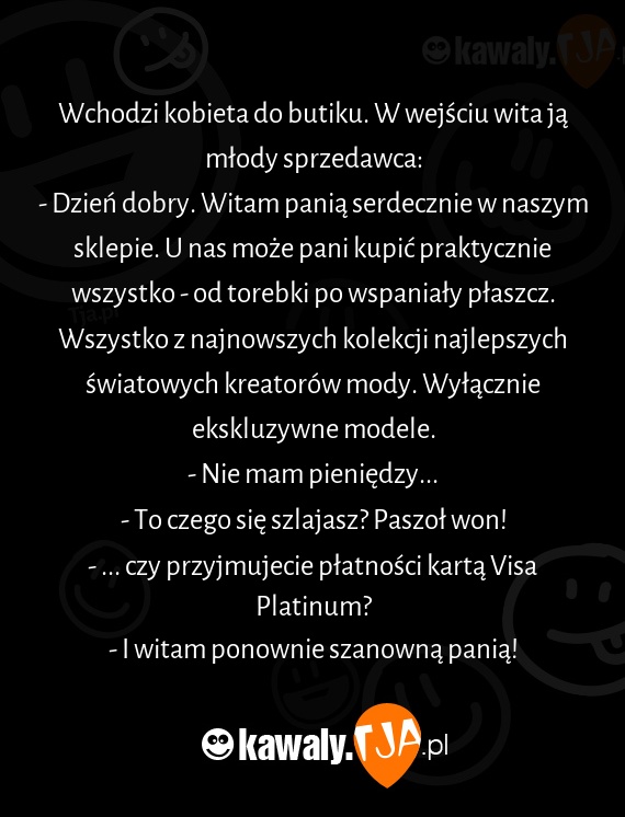 Wchodzi kobieta do butiku. W wejściu wita ją młody sprzedawca: