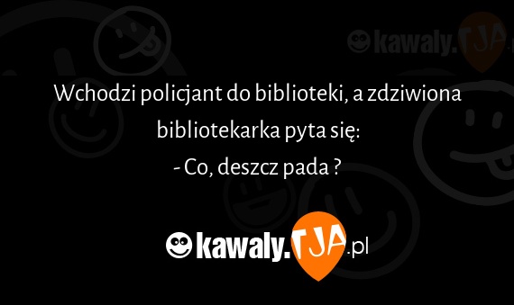Wchodzi policjant do biblioteki, a zdziwiona bibliotekarka pyta się: - Co, deszcz pada ?