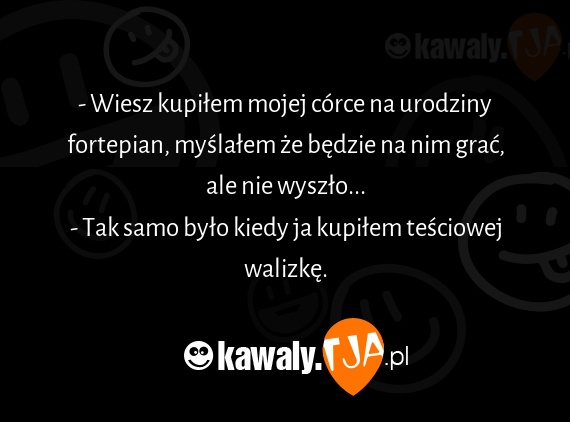 - Wiesz kupilem mojej corce na urodziny fortepian, myslalem ze bedzie na nim grac, ale nie wyszlo... - Tak samo bylo kiedy ja kupilem tesciowej walizke.