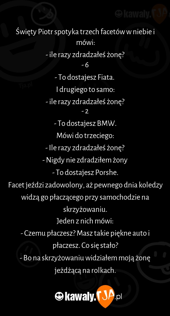 Święty Piotr spotyka trzech facetów w niebie i mówi: