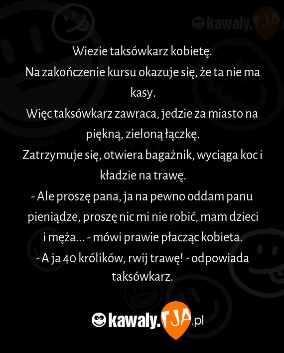 - A ja 40 królików, rwij trawę! - odpowiada taksówkarz.