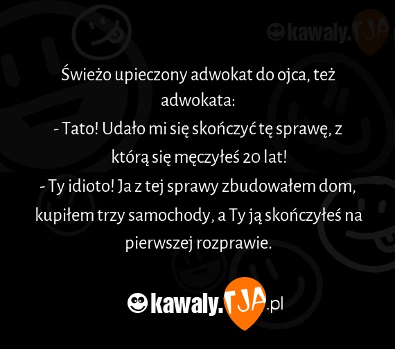 Świeżo upieczony adwokat do ojca, też adwokata: - Tato! Udało mi się skończyć tę sprawę, z którą się męczyłeś 20 lat! - Ty idioto! Ja z tej sprawy zbudowałem dom, kupiłem trzy samochody, a Ty ją skończyłeś na pierwszej rozprawie.