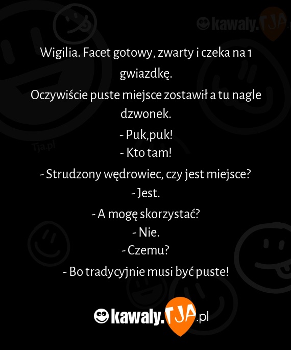 Wigilia. Facet gotowy, zwarty i czeka na 1 gwiazdkę. Oczywiście puste miejsce zostawił a tu nagle dzwonek. - Puk,puk! - Kto tam! - Strudzony wędrowiec, czy jest miejsce? - Jest. - A mogę skorzystać? - Nie. - Czemu? - Bo tradycyjnie musi być puste!