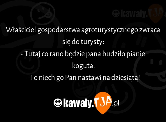 Wlasciciel gospodarstwa agroturystycznego zwraca sie do turysty: - Tutaj co rano bedzie pana budzilo pianie koguta. - To niech go Pan nastawi na dziesiata!