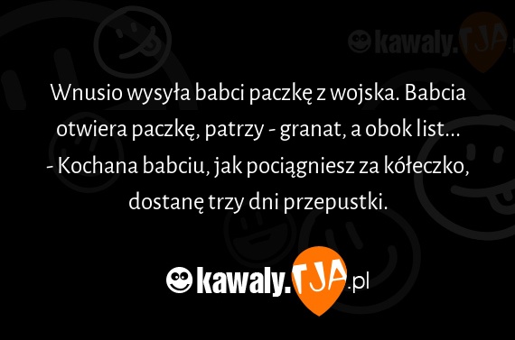 Wnusio wysyła babci paczkę z wojska. Babcia otwiera paczkę, patrzy - granat, a obok list... - Kochana babciu, jak pociągniesz za kółeczko, dostanę trzy dni przepustki.