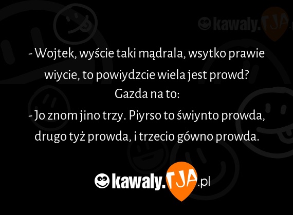 - Wojtek, wyscie taki madrala, wsytko prawie wiycie, to powiydzcie wiela jest prowd? Gazda na to: - Jo znom jino trzy. Piyrso to swiynto prowda, drugo tyz prowda, i trzecio gowno prowda.