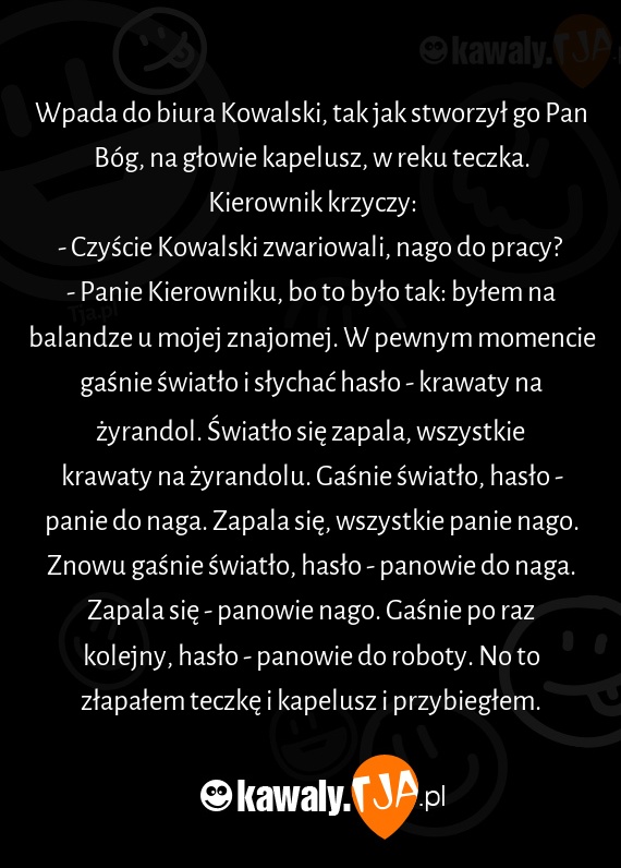 - Panie Kierowniku, bo to było tak: byłem na balandze u mojej znajomej. W pewnym momencie gaśnie światło i słychać hasło - krawaty na żyrandol. Światło się zapala, wszystkie krawaty na żyrandolu. Gaśnie światło, hasło - panie do naga. Zapala się, wszystkie panie nago. Znowu gaśnie światło, hasło - panowie do naga. Zapala się - panowie nago. Gaśnie po raz kolejny, hasło - panowie do roboty. No to złapałem teczkę i kapelusz i przybiegłem.