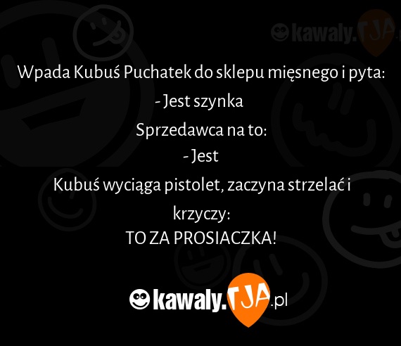 Wpada Kubuś Puchatek do sklepu mięsnego i pyta: - Jest szynka Sprzedawca na to: - Jest Kubuś wyciąga pistolet, zaczyna strzelać i krzyczy: TO ZA PROSIACZKA!