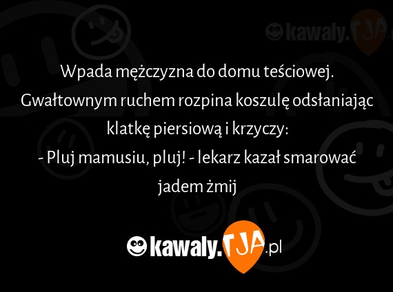 Wpada mezczyzna do domu tesciowej. Gwaltownym ruchem rozpina koszule odslaniajac klatke piersiowa i krzyczy: - Pluj mamusiu, pluj! - lekarz kazal smarowac jadem zmij