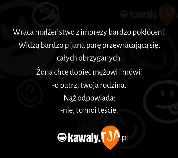 Wraca małżeństwo z imprezy bardzo pokłóceni. Widzą bardzo pijaną parę przewracającą się, całych obrzyganych. Żona chce dopiec mężowi i mówi: -o patrz, twoja rodzina. Nąż odpowiada: -nie, to moi teście.