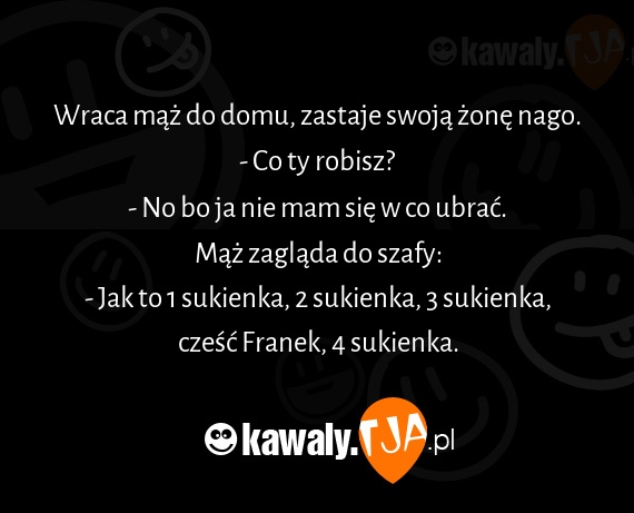 Wraca mąż do domu, zastaje swoją żonę nago. - Co ty robisz? - No bo ja nie mam się w co ubrać. Mąż zagląda do szafy: - Jak to 1 sukienka, 2 sukienka, 3 sukienka, cześć Franek, 4 sukienka.