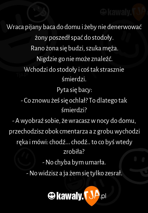 Wraca pijany baca do domu i żeby nie denerwować żony poszedł spać do stodoły.