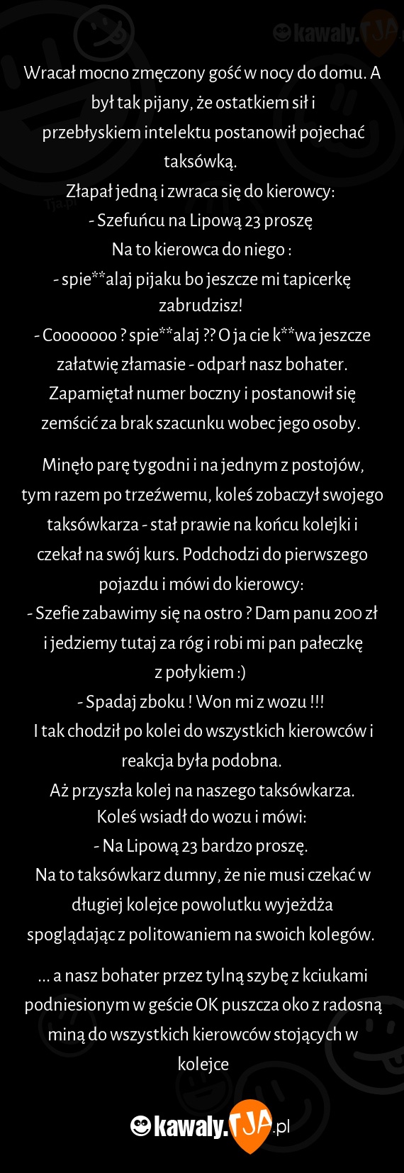 Minęło parę tygodni i na jednym z postojów, tym razem po trzeźwemu, koleś zobaczył swojego taksówkarza - stał prawie na końcu kolejki i czekał na swój kurs. Podchodzi do pierwszego pojazdu i mówi do kierowcy:
