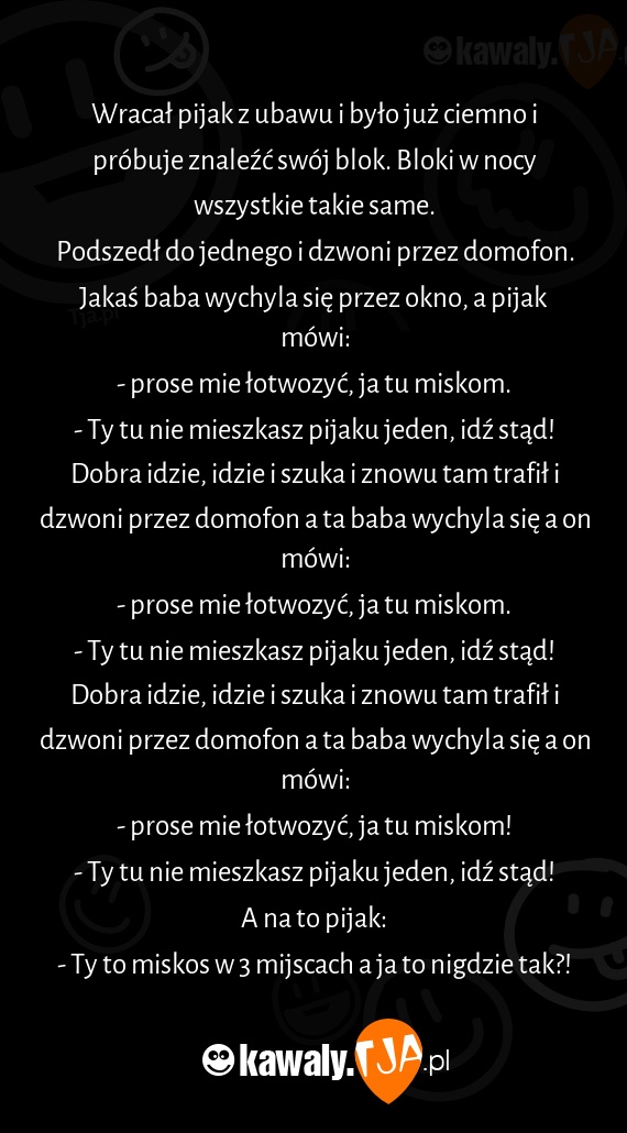 Wracał pijak z ubawu i było już ciemno i próbuje znaleźć swój blok. Bloki w nocy wszystkie takie same.