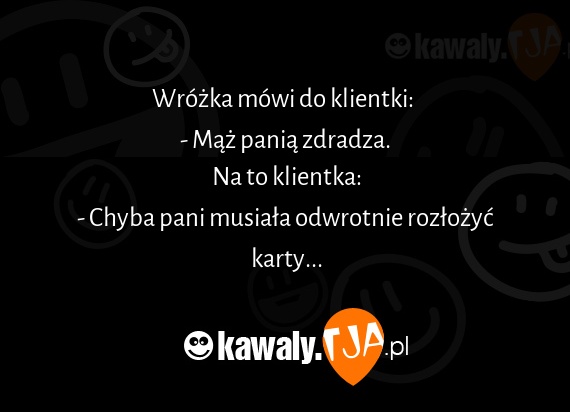 Wróżka mówi do klientki: - Mąż panią zdradza. Na to klientka: - Chyba pani musiała odwrotnie rozłożyć karty...