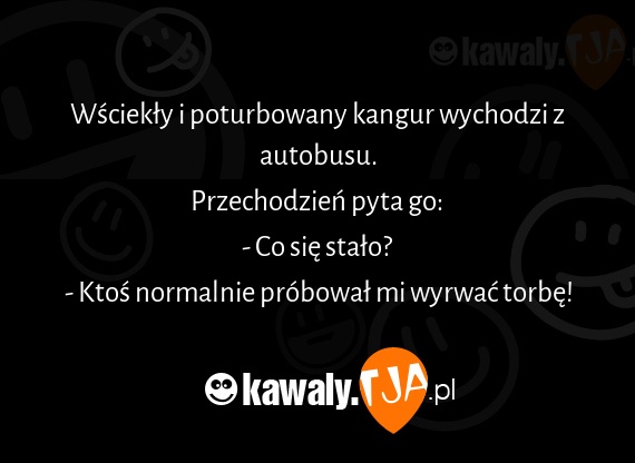 Wściekły i poturbowany kangur wychodzi z autobusu. Przechodzień pyta go: - Co się stało? - Ktoś normalnie próbował mi wyrwać torbę!