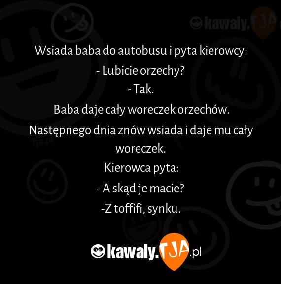 Wsiada baba do autobusu i pyta kierowcy: - Lubicie orzechy? - Tak. Baba daje cały woreczek orzechów. Następnego dnia znów wsiada i daje mu cały woreczek. Kierowca pyta: - A skąd je macie? -Z toffifi, synku.