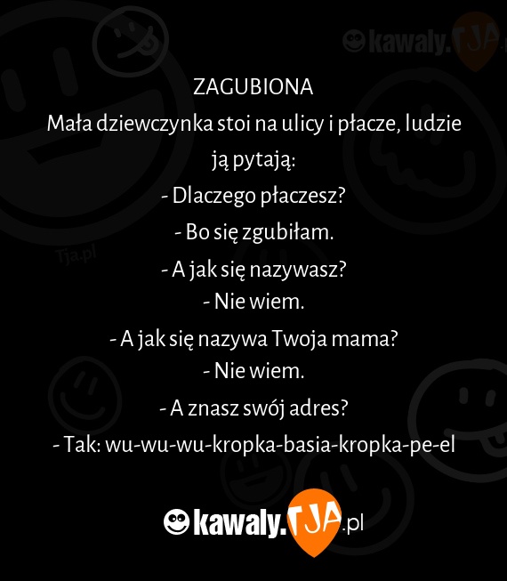 ZAGUBIONA Mała dziewczynka stoi na ulicy i płacze, ludzie ją pytają: - Dlaczego płaczesz? - Bo się zgubiłam. - A jak się nazywasz? - Nie wiem. - A jak się nazywa Twoja mama? - Nie wiem. - A znasz swój adres? - Tak: wu-wu-wu-kropka-basia-kropka-pe-el
