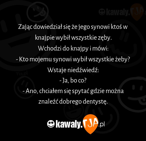 Zajac dowiedzial sie ze jego synowi ktos w knajpie wybil wszystkie zeby. Wchodzi do knajpy i mowi: - Kto mojemu synowi wybil wszystkie zeby? Wstaje niedxwiedx: - Ja, bo co? - Ano, chcialem sie spytac gdzie mozna znalexc dobrego dentyste.