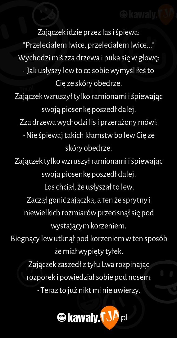 Zajączek idzie przez las i śpiewa: "Przeleciałem lwice, przeleciałem lwice..."