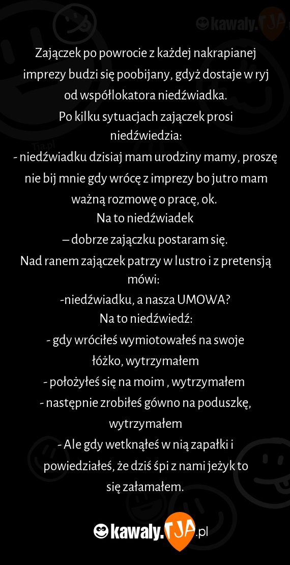 - niedźwiadku dzisiaj mam urodziny mamy, proszę nie bij mnie gdy wrócę z imprezy bo jutro mam ważną rozmowę o pracę, ok.