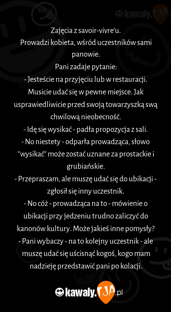 - No cóż - prowadząca na to - mówienie o ubikacji przy jedzeniu trudno zaliczyć do kanonów kultury. Może jakieś inne pomysły?