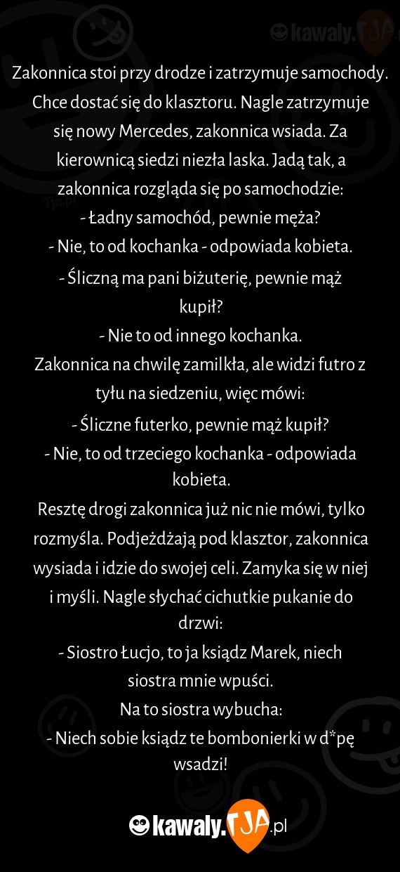 Zakonnica stoi przy drodze i zatrzymuje samochody. Chce dostać się do klasztoru. Nagle zatrzymuje się nowy Mercedes, zakonnica wsiada. Za kierownicą siedzi niezła laska. Jadą tak, a zakonnica rozgląda się po samochodzie: