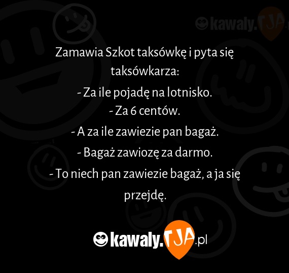 Zamawia Szkot taksowke i pyta sie taksowkarza: - Za ile pojade na lotnisko. - Za 6 centow. - A za ile zawiezie pan bagaz. - Bagaz zawioze za darmo. - To niech pan zawiezie bagaz, a ja sie przejde.