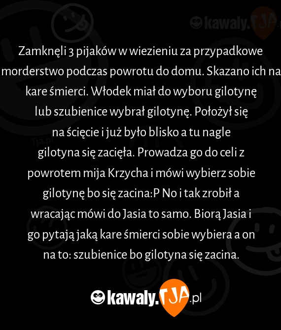 Zamknęli 3 pijaków w wiezieniu za przypadkowe morderstwo podczas powrotu do domu. Skazano ich na kare śmierci. Włodek miał do wyboru gilotynę lub szubienice wybrał gilotynę. Położył się na ścięcie i już było blisko a tu nagle gilotyna się zacięła. Prowadza go do celi z powrotem mija Krzycha i mówi wybierz sobie gilotynę bo się zacina:P No i tak zrobił a wracając mówi do Jasia to samo. Biorą Jasia i go pytają jaką kare śmierci sobie wybiera a on na to: szubienice bo gilotyna się zacina.