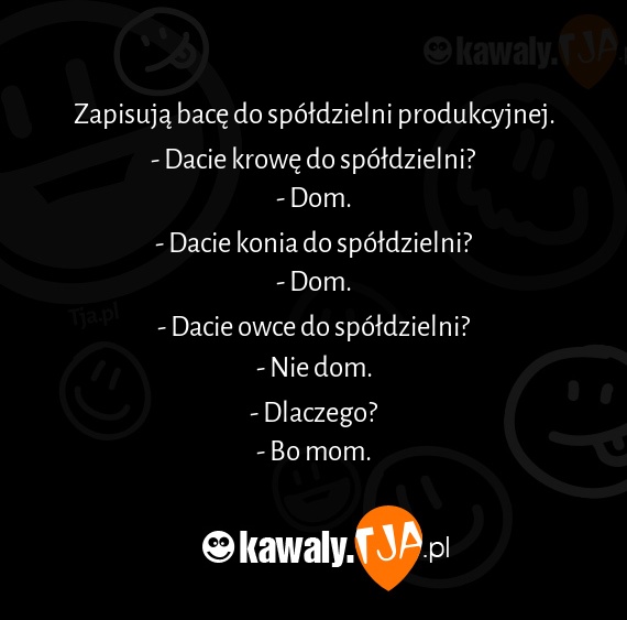 Zapisuja bace do spoldzielni produkcyjnej. - Dacie krowe do spoldzielni? - Dom. - Dacie konia do spoldzielni? - Dom. - Dacie owce do spoldzielni? - Nie dom. - Dlaczego? - Bo mom.