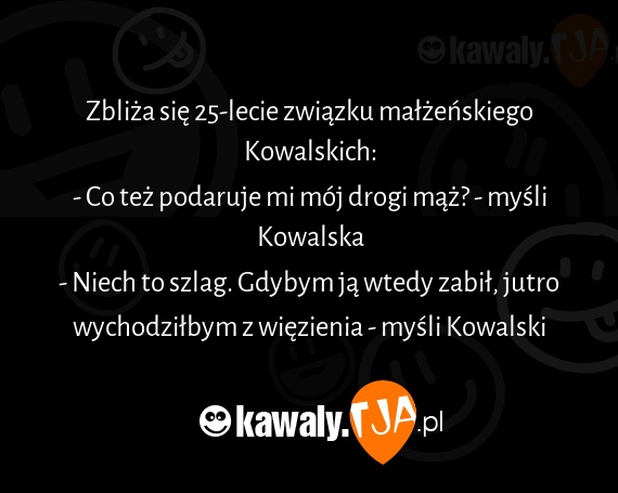 Zbliza sie 25-lecie zwiazku malzenskiego Kowalskich: - Co tez podaruje mi moj drogi maz? - mysli Kowalska - Niech to szlag. Gdybym ja wtedy zabil, jutro wychodzilbym z wiezienia - mysli Kowalski