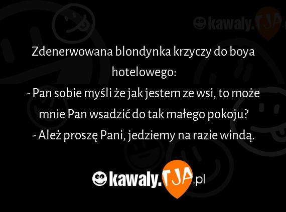Zdenerwowana blondynka krzyczy do boya hotelowego: - Pan sobie mysli ze jak jestem ze wsi, to moze mnie Pan wsadzic do tak malego pokoju? - Alez prosze Pani, jedziemy na razie winda.