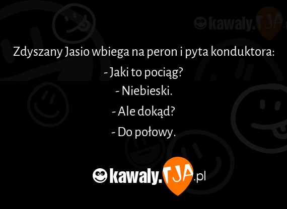 Zdyszany Jasio wbiega na peron i pyta konduktora: - Jaki to pociag? - Niebieski. - Ale dokad? - Do polowy.