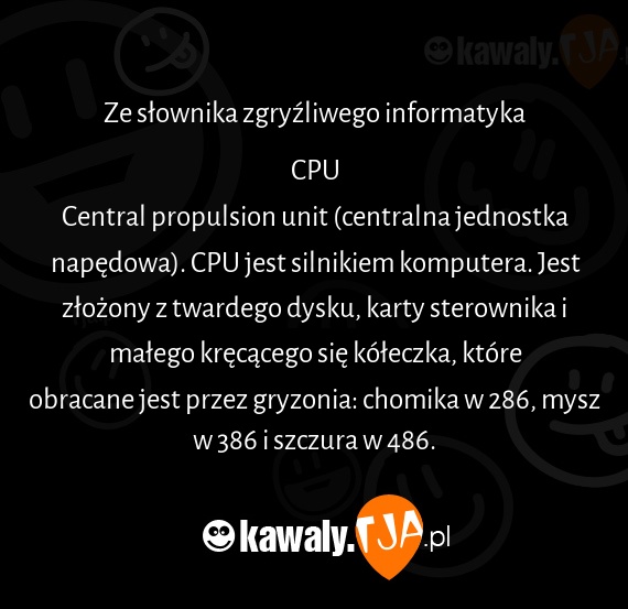 Ze słownika zgryźliwego informatyka CPU Central propulsion unit (centralna jednostka napędowa). CPU jest silnikiem komputera. Jest złożony z twardego dysku, karty sterownika i małego kręcącego się kółeczka, które obracane jest przez gryzonia: chomika w 286, mysz w 386 i szczura w 486.