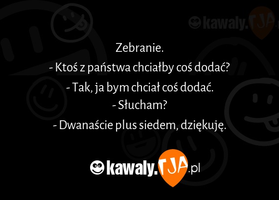 Zebranie. - Ktos z panstwa chcialby cos dodac? - Tak, ja bym chcial cos dodac. - Slucham? - Dwanascie plus siedem, dziekuje.