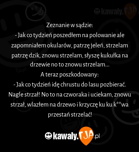 - Jak co tydzień poszedłem na polowanie ale zapomniałem okularów, patrzę jeleń, strzelam patrzę dzik, znowu strzelam, słyszę kukułka na drzewie no to znowu strzelam...