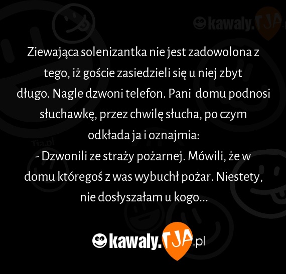 Ziewająca solenizantka nie jest zadowolona z tego, iż goście zasiedzieli się u niej zbyt długo. Nagle dzwoni telefon. Pani domu podnosi słuchawkę, przez chwilę słucha, po czym odkłada ja i oznajmia: