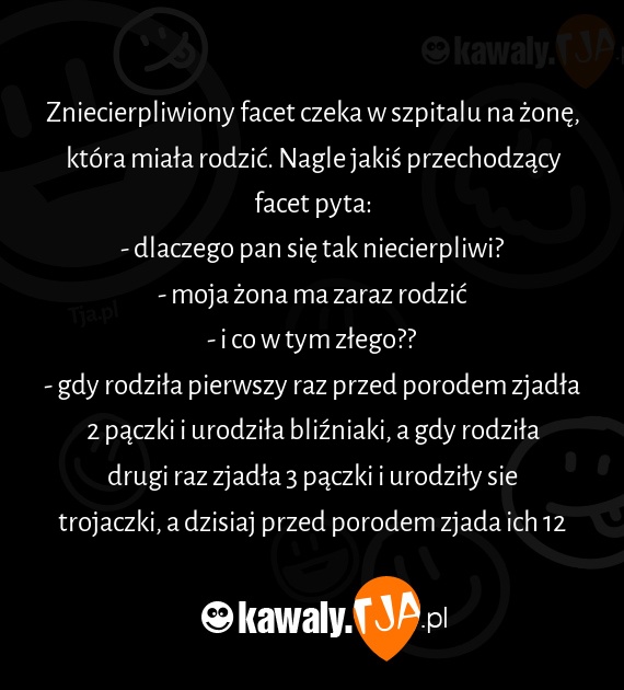Zniecierpliwiony facet czeka w szpitalu na żonę, która miała rodzić. Nagle jakiś przechodzący facet pyta: