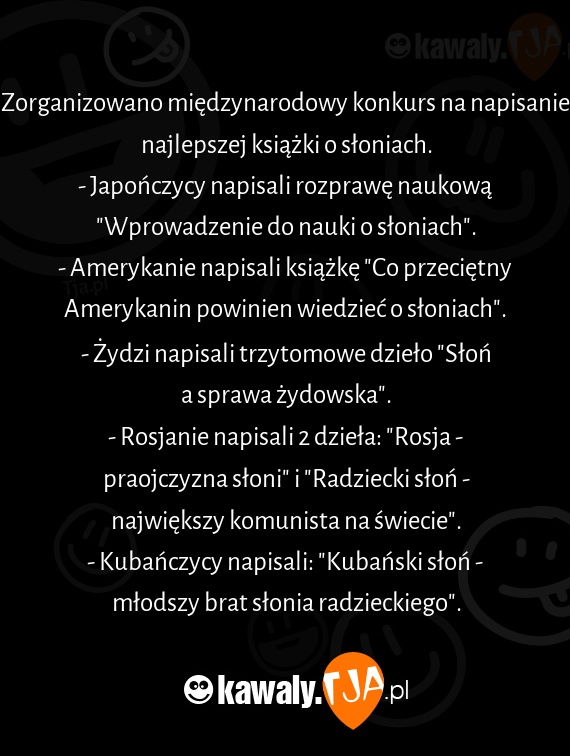 Zorganizowano miedzynarodowy konkurs na napisanie najlepszej ksiazki o sloniach. - Japonczycy napisali rozprawe naukowa "Wprowadzenie do nauki o sloniach". - Amerykanie napisali ksiazke "Co przecietny Amerykanin powinien wiedziec o sloniach". - Zydzi napisali trzytomowe dzielo "Slon a sprawa zydowska". - Rosjanie napisali 2 dziela: "Rosja - praojczyzna sloni" i "Radziecki slon - najwiekszy komunista na swiecie". - Kubanczycy napisali: "Kubanski slon - mlodszy brat slonia radzieckiego".