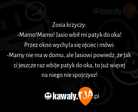 Zosia krzyczy: -Mamo!Mamo! Jasio wbil mi patyk do oka! Przez okno wychyla sie ojciec i mowi: -Mamy nie ma w domu, ale Jasiowi powiedz, ze jak ci jeszcze raz wbije patyk do oka, to juz wiecej na niego nie spojrzysz!