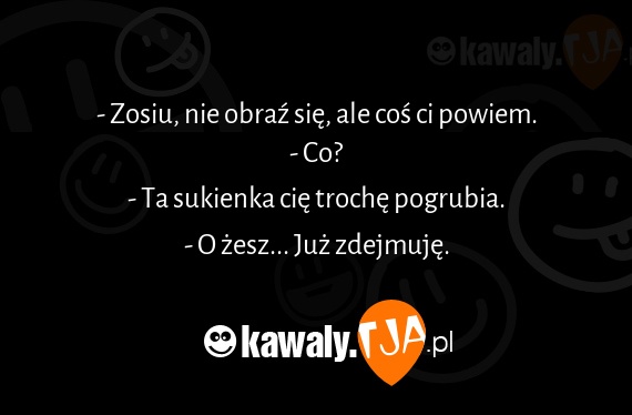 - Zosiu, nie obraź się, ale coś ci powiem. - Co? - Ta sukienka cię trochę pogrubia. - O żesz... Już zdejmuję.