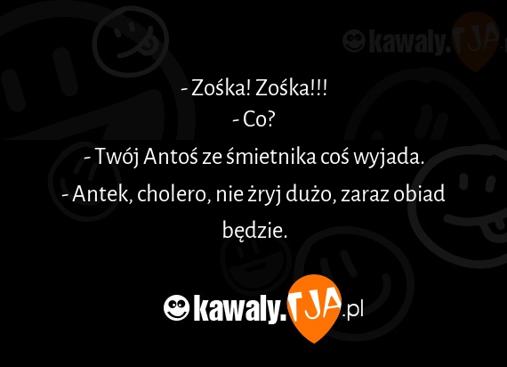 - Zoska! Zoska!!! - Co? - Twoj Antos ze smietnika cos wyjada. - Antek, cholero, nie zryj duzo, zaraz obiad bedzie.
